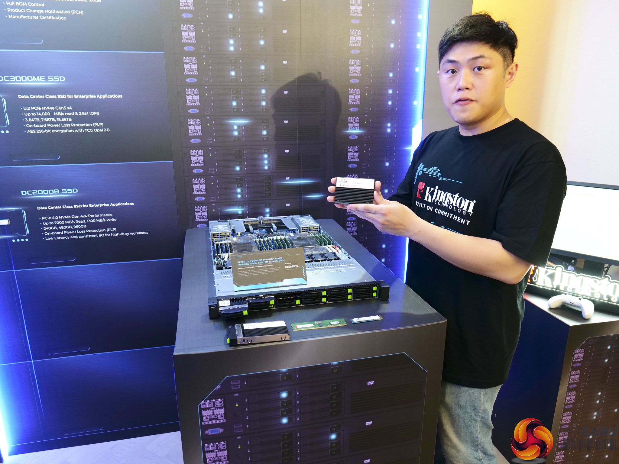 Upon entering the Kingston booth, we immediately get a look at a server rack, housing a stack of Kingston Server Premier DDR5 memory, and Kingston's Data Center-class SSDs.