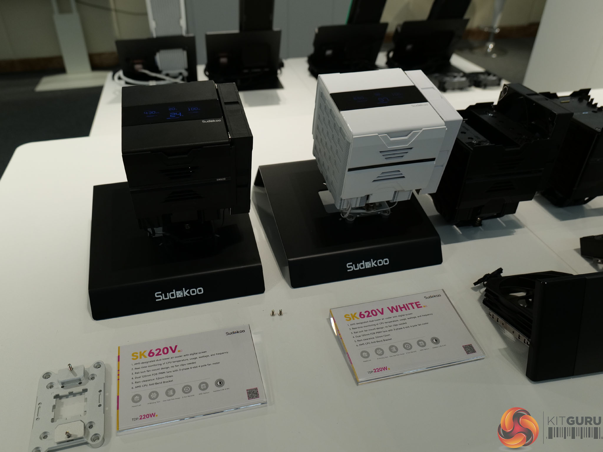 Our first point of call is Sudokoo's new flagship air cooler, the SK620V. This cooler is available in black or white and currently only comes with mounting hardware for AMD motherboards, so you'll want to pair this with an AM5 socket CPU. One of the standout features is a slide rail for the front fan, so you can move it up or down depending on how much room you need for RAM. The SK700V is a more expensive version of the cooler with a digital display embedded in the top shroud.