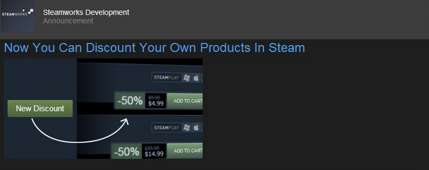 “As with the addition of a ‘Recently Updated' section to Steam, this is another effort to shorten the distance between developers and customers. This new Steamworks tool allows developers to configure discounts for their own products, on their own schedules. They can define custom sale periods or opt in to regularly scheduled sales. This will enable developers to better coordinate their promotions with events, announcements, or major updates they are planning for their products.”