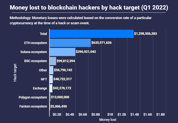 NFTs also make an appearance here, with the researchers estimating that $48 million was stolen in recent months. NFTs were also the most common target for hackers in Q1, followed by Ethereum, and then the Binance Smart Chain.
