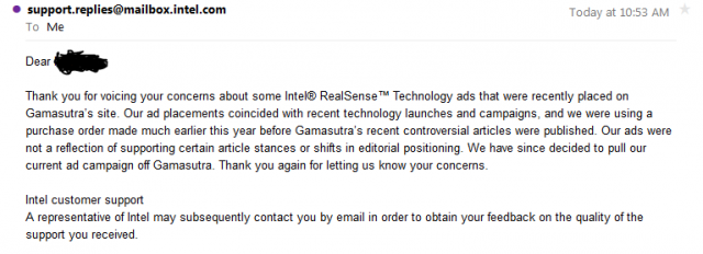#GamerGate supporters got in touch with Intel over its advertising campaign and expressed concerns that the chip maker shouldn't be associating itself with sites that consistently attack their audience. One supporter received this email back: