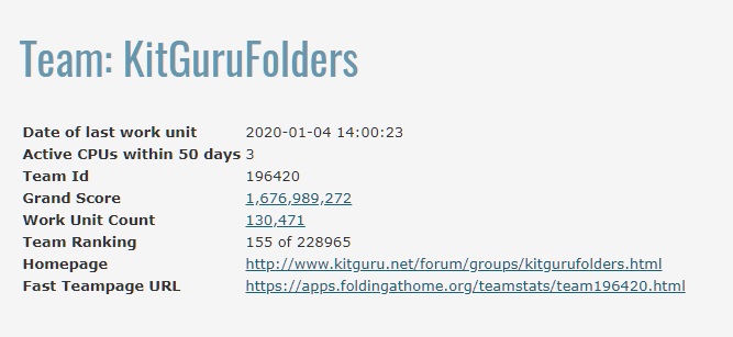 The KitGuruFolders team is currently ranked 155 out of 228,965 teams, according to the folding at home stats page. Our very own LimeyGeorge (Andrew) is the top ranked and is also in the top 850 Folding@Home contributors worldwide, which is an incredible effort.