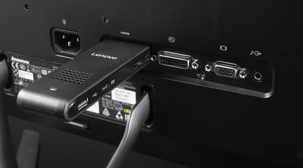 While Intel's compute stick retails at $150 in the US, Lenovo is offering its own for $130 instead. On the side of the dongle are some inputs, including a USB port, a micro USB port and a full sized SD Card reader.
