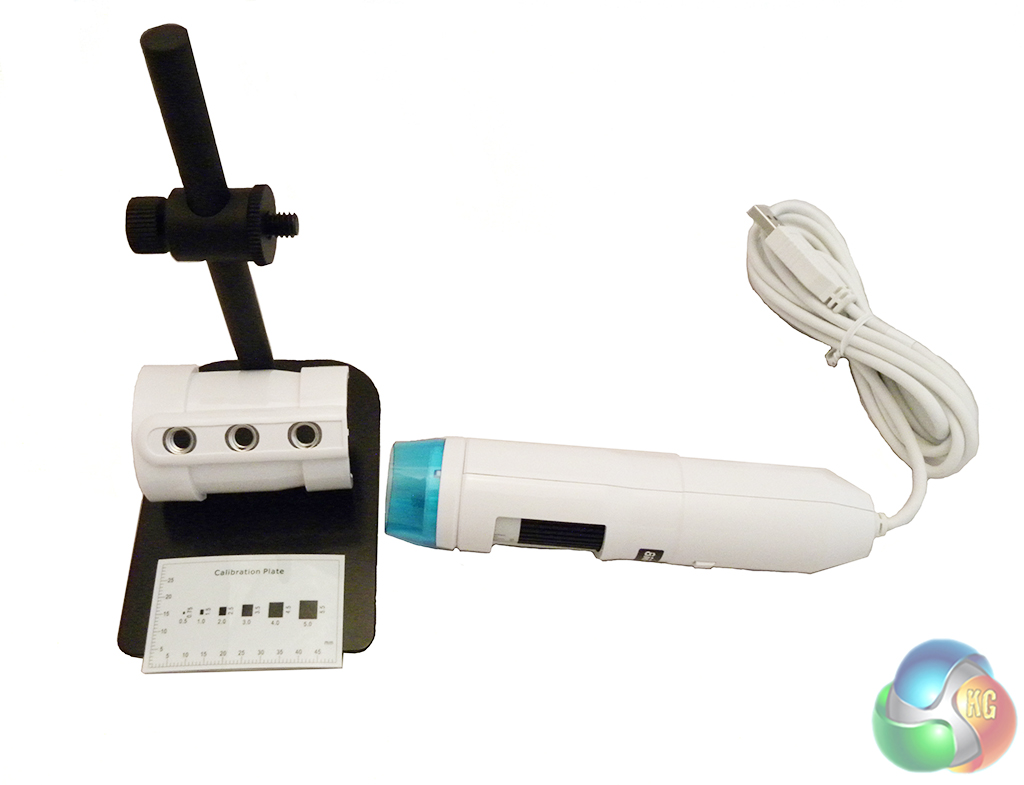 Once inside the box we have the Microscope itself, a plain software disk, a Microscope stand, a clip holder and a calibration plate.