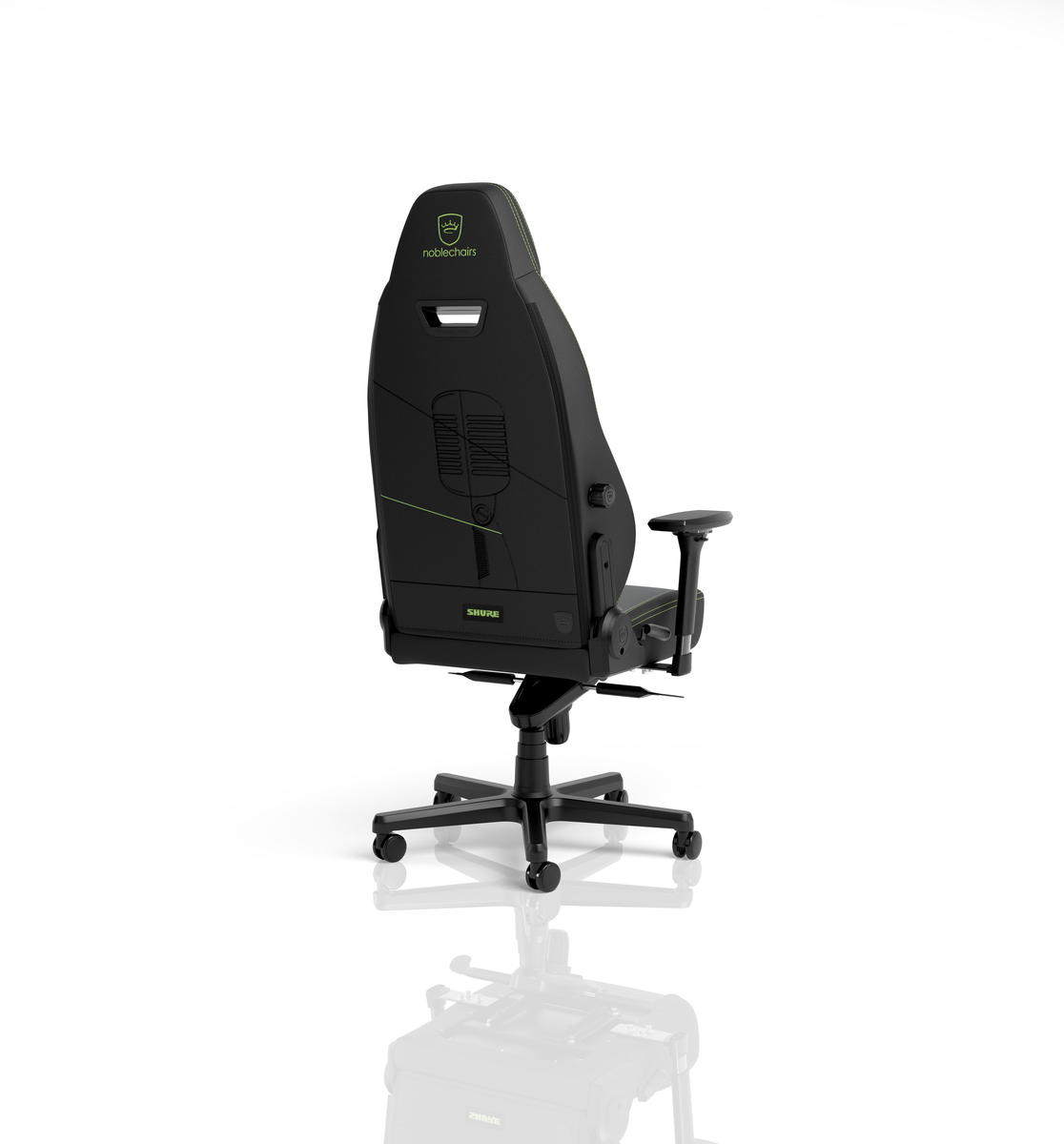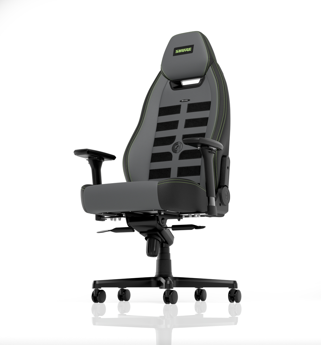 The noblechairs Legend Shure Edition was created in partnership with Shure, offering a black and grey look that pays homage to the iconic Shure 55SH microphone, with green stitching. The design is completed with a green Shure logo, which also appears on the optional memory foam headrest pillow.