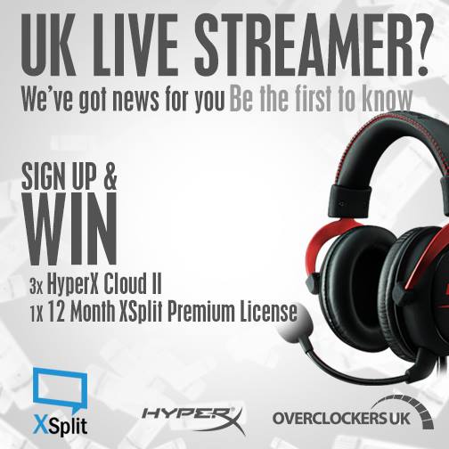 Overclockers UK has a little something in store for UK based live-streamers on Twitch, so to get the ball rolling, here is a little giveaway running. If you are a UK streamer, you could end up winning yourself one of three Kingston HyperX Cloud II headsets, while one person will manage to nab themselves a 12 month premium license for XSplit.
