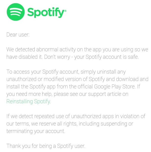 In the email, Spotify warns users that it has “detected abnormal activity on the app” they are using. These accounts are not being outright banned, instead, the email encourages users of the modded APK to head to the official Google Play store in order to download the official app.