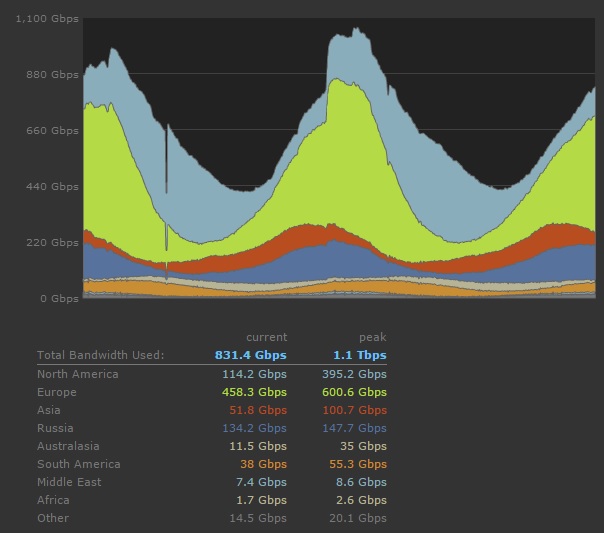 This download stats feature has been available for a while but has mostly been overlooked. As we can see from the graph, Europe is currently using more bandwidth than any other continent. Russia and North America are pretty close on the bandwidth scale with Africa and the Middle East using very little.
