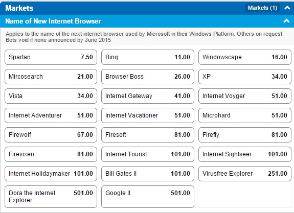 Most people appear to be expecting the browser to be named Spartan, which is currently offered for AU$7.50. The most expensive bet is obviously Dora the Internet Explorer, valued at $501.