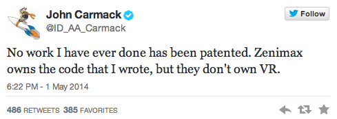 “It was only through the concerted efforts of Mr. Carmack, using technology developed over many years at, and owned by, ZeniMax, that [Oculus founder Palmer] Luckey was able to transform his garage-based pipe dream into a working reality.”