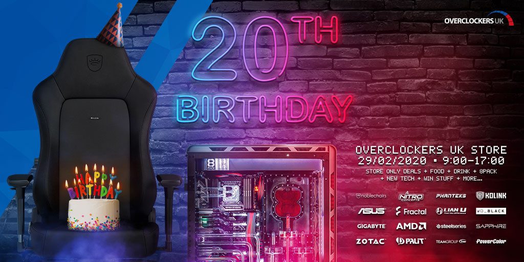 For those of you who wish to join Overclockers UK at its 20th birthday event in-store on the 29th February, you can head over to the event page and check out what will be going on. There is also a Facebook page set up where you can let people know you will be going. Overclockers UK will be opening its doors and beginning the celebrations from 9 am on Saturday 29th February, so make sure you are there bright and early.