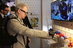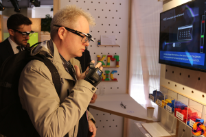 As part of its reinvention, Konica Minolta has set up a European Labs network to experiment with new concepts in workplace practice, and examples of the Labs' experimentation were also on show at Spotlight Live. One of the things they have been developing was the Google Glass-like Augmented Reality heads-up display system shown below.