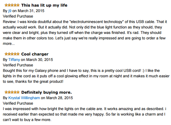 One of the products cited in the lawsuit references a USB cable that fake-reviewers claimed had ‘lit up their life,' and that the LEDs on them cable were surprisingly and impressively bright.