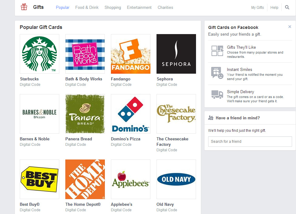 Initially Facebook experimented in its gift store by offering physical products like socks, flowers, sweets and other items, but ended that service shortly after, instead choosing to focus on selling vouchers and discount codes to keep the entire experience a digital one.