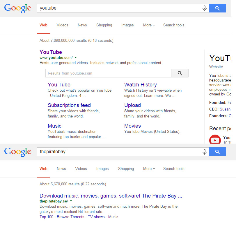 While Googling for a site like Youtube now brings up the site itself and several other links to popular sections like your watch history or subscription feed, searching for “ThePirateBay” simply brings up a link to the site. While to some extent, it's impressive that that listing remains, considering the amount of result removal the studios and lobby groups have been gunning for in recent years, it's interesting that in this instance Google seemed to take a pre-emptive step, rather than wait for the anti-torrent groups to get in touch.