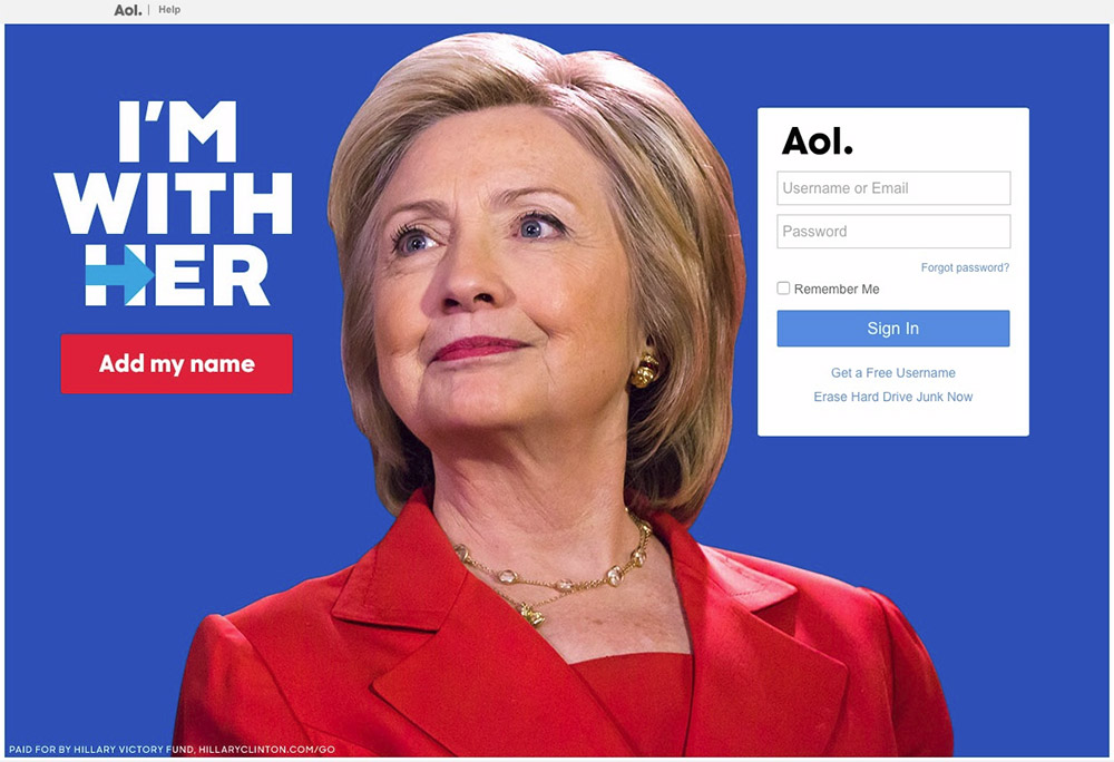 Although you can't see the advert if you are visiting the site from the UK, on the U.S. AOL Mail page, Clinton's face takes up the entire backdrop, with a short phrase reading “I'm with her,” and the ability to sign some sort of register that you're going to vote Hilary when the times comes.