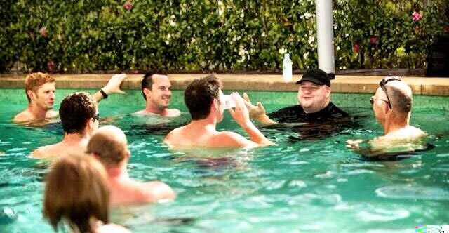 Along with speeches on party policy, picture taking opportunities with the man himself and refreshments for all, there was also time for a quick dip in the pool. With Kim Dotcom. Why not?