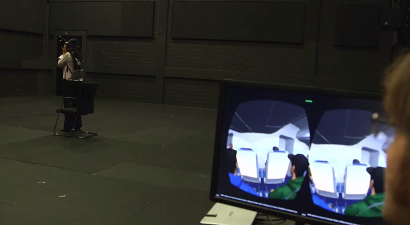 Cameras mounted on the walls handle the positional tracking, giving more accurate data for the researchers about the user's placement. Ultimately though, it's all so they can mess with them. The big research being done in this Holodeck like set up, is how much can they manipulate the virtual world, without the user catching on. For example, the Rift user may think they've walked forward, left and then right, but in reality have simply walked in a circle. Using tweaks to the virtual environment, can you trick someone into thinking they've done something they haven't?
