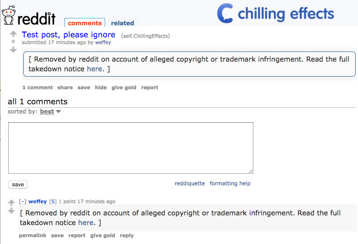 On top of that, Reddit will also post a more detailed commentary on the removal on /r/ChillingEffects and on ChillingEffects.org, where other site's DMCA takedown notices are made available.