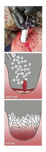 While more traditional implements like improvised tourniquets are still recommended for extremities and appendages, when the wound is somewhere that's difficult to clamp or apply pressure to, the XStat syringe could potentially be a life saver. Each one is filled with compressed sponges coated in coagulant, which when injected into the wound expand, causing pressure that helps stem blood flow and when combined with the coagulant, are able to significantly stop blood loss, if not completely.