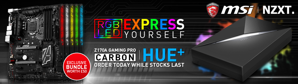 MSI and NZXT both recently jumped on to the RGB craze, MSI currently has the Z170A Gaming Pro Carbon motherboard, which features a black aesthetic with RGB lights on the board and NZXT just recently launched the Hue+ RGB lighting kit, now to celebrate these launches, both companies are teaming up to offer an RGB bundle, featuring the motherboard and lighting kit.