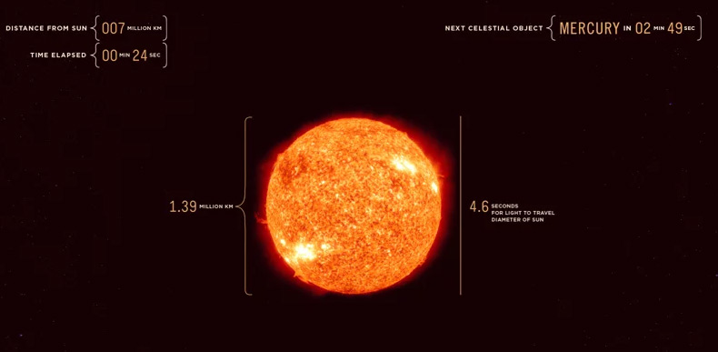 And you aren't much closer at the half hour mark either. Or at 45 minutes, when you fly by Jupiter and its many moons and the Sun just looks like a brighter pinprick in a sky of stars. At that point you've travelled over three quarters of a billion kilometres and you have so much further to go if you want to get somewhere new.