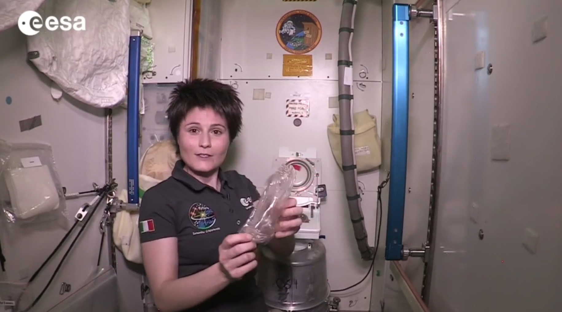 ESA astronaut Samantha Cristoforetti seen here demonstrating the polite replacement of the poo bag.