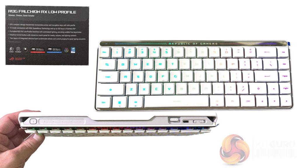 The ROG Falchion RX Low Profile Keyboard is a low-profile 65% option with a protective cover and UV-coated keycaps. Battery is rated at 430 hours with RGB off and the pre-lubed ROG RX low profile switches should give a sleek gaming experience – according to ASUS.