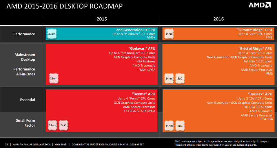 For years, AMD used its low-cost/low-power micro-architectures for its accelerated processing units aimed at inexpensive and energy-efficient notebooks and desktops. In 2016, the company plans to use its high-performance “Zen” micro-architecture to build APUs aimed at basic PCs.