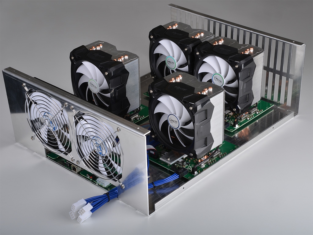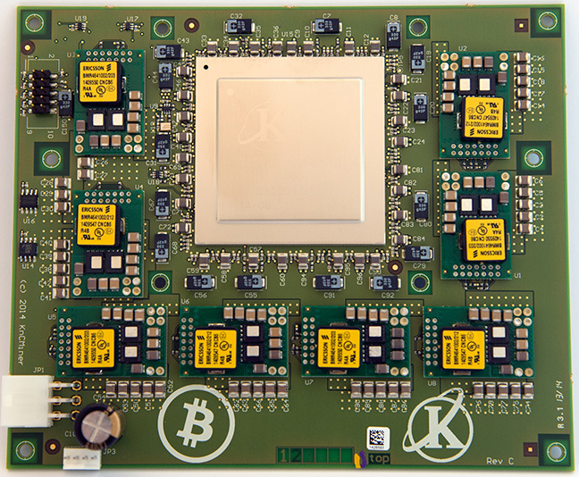 The Neptune mining device, which is based on four Neptune MCM cards, churns out more than 3TH/s [terahash per second] while consuming 2.1KW from the power outlet, which translates to 0.7W per GH/s or less, according to KnC Miner. Each Neptune requires three 850W or two 1200W power supply units. According to the developer, the 20nm process technology allowed the company to cut power consumption of the Neptune by around 30 per cent.