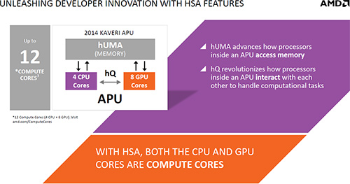 The Kaveri is AMD’s new-generation A-series APU that combines four x86 general-purpose “Steamroller” cores with eight graphics compute units (CUs) based on the GCN architecture on the same die. Thanks to the fact that Kaveri features HSA technology, heterogeneous unified memory architecture (hUMA) and heterogeneous queuing (hQ), software applications can use both x86 and graphics compute cores at the same time and very efficiently. According to AMD, its Kaveri APUs can run up to 12 separate processes simultaneously thanks to the fact that it has twelve compute cores.