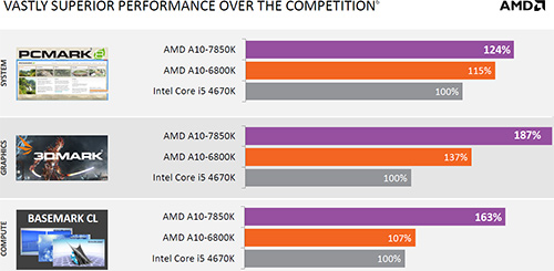 According to AMD’s internal performance tests, the new AMD A10-7850K “Kaveri” accelerated processing unit is 24% – 87% faster compared to Intel Core i5-4670K in synthetic applications. This, however, does not mean that the new chip will be faster in real-world tasks.