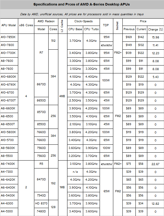 In addition, AMD reduced prices on select A-series APUs that belong to the previous-generation code-named “Richland”, according to the information AMD provided to the Tech Report and Tom’s Hardware.