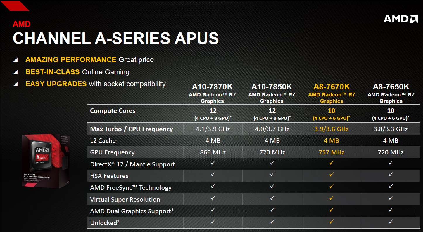“AMD takes great strides to deliver innovative technology that provides the performance and convenience customers need today and tomorrow,” said Kevin Lensing, senior director of client business unit at AMD. “The AMD A8-7670K APU is no exception. Our newest APU provides a smooth user experience and is engineered for Windows 10 and eSports online gaming.”