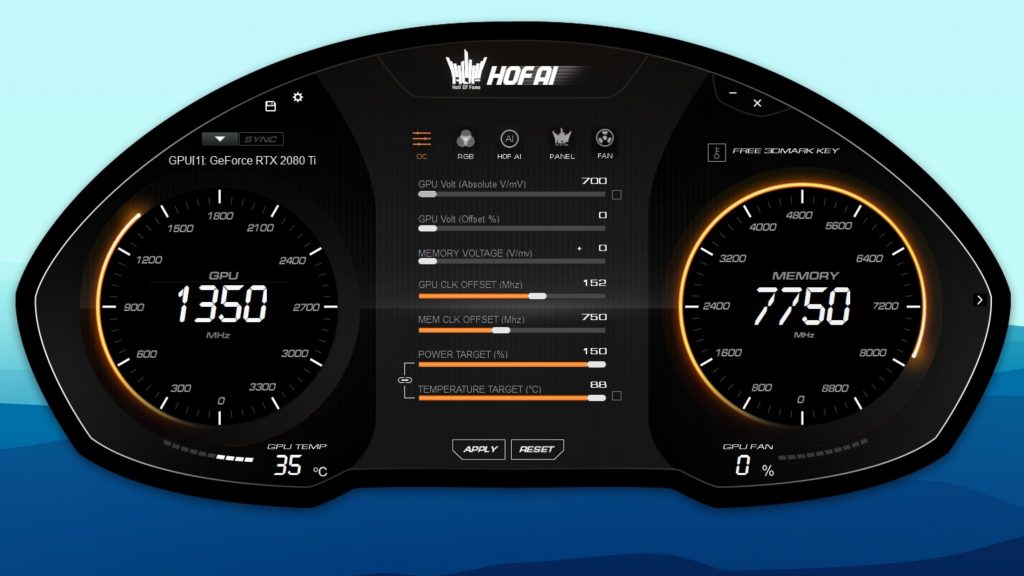 With the KFA2 HOF RTX 2080 Ti specifically designed for overclocking, it would be a crime not to put it through its paces and squeeze out as much performance as possible. I pushed the hyperboost button on the back of the card which sets the fans to 100% and got to work. I used the HOF AI software rather than something like MSI Afterburner as it has all the settings for the RGB and LED display. However, it also seemed to work really well and is much improved over the KFA2 Xtreme tuner software I was used to using on my GTX 1070 Ti.