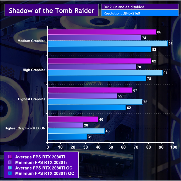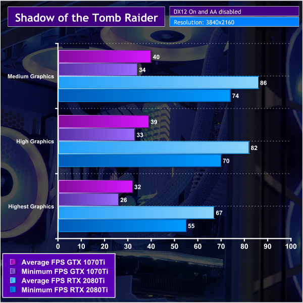 I tested Shadow of the Tomb Raider at 4K resolution with DX12 On and AA disabled using the Medium, High and Highest preset graphics settings.