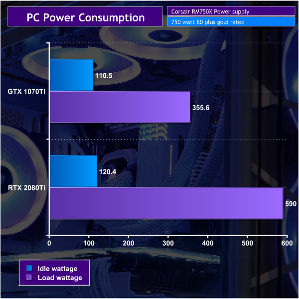 My PC uses a Corsair RM750X power supply which is perfect for my current system. Power supplies are normally most efficient between 50-60% load and with my 1070 Ti drawing 350W it was pretty much bang on and barely breaking a sweat most of the time. Now, although the RM750X meets the RTX 2080 Ti's minimum requirement for a 650W PSU, it's safe to say that it won't be living the easy life from now on when my PC is under load. Before I purchase a CPU it looks like a 1000W PSU will have to be next on my upgrade list!