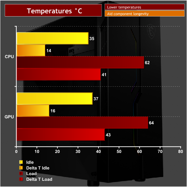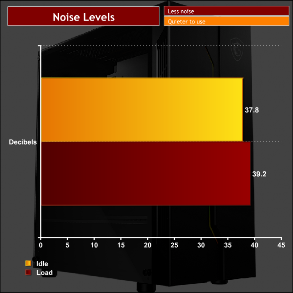 When idle, the fan noise coming from the MAG Vampiric 010 is just about audible at 37.8 decibels. The included 120mm RGB fan & 140mm BeQuiet! fans that I installed in the case to provide additional airflow don't create much noise at all. While under heavy load there is a slight increase in noise to 39.2 decibels but this is a lot quieter than some other cases we have tested. Noise levels will obviously vary depending on components but the closed-off design of this case prevents too much noise escaping.