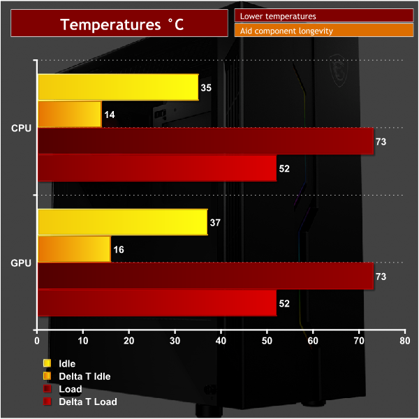 Idle temperatures are 14C-16C above ambient, with the CPU sitting at 35C and the GPU idling at 37C. This is pretty much as expected and is the same temperature I see regularly with my case reviews featuring the same or similar components. To test how hot the components got inside the Vampiric under heavy load they were stress tested using AIDA64 and the UNIGINE Heaven benchmark for 10 minutes.
