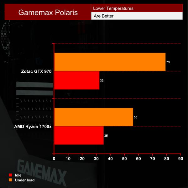 The four case fans working together (alongside the 1 x 120 Riing fan for the CPU cooler) were able to cool the system adequately.
