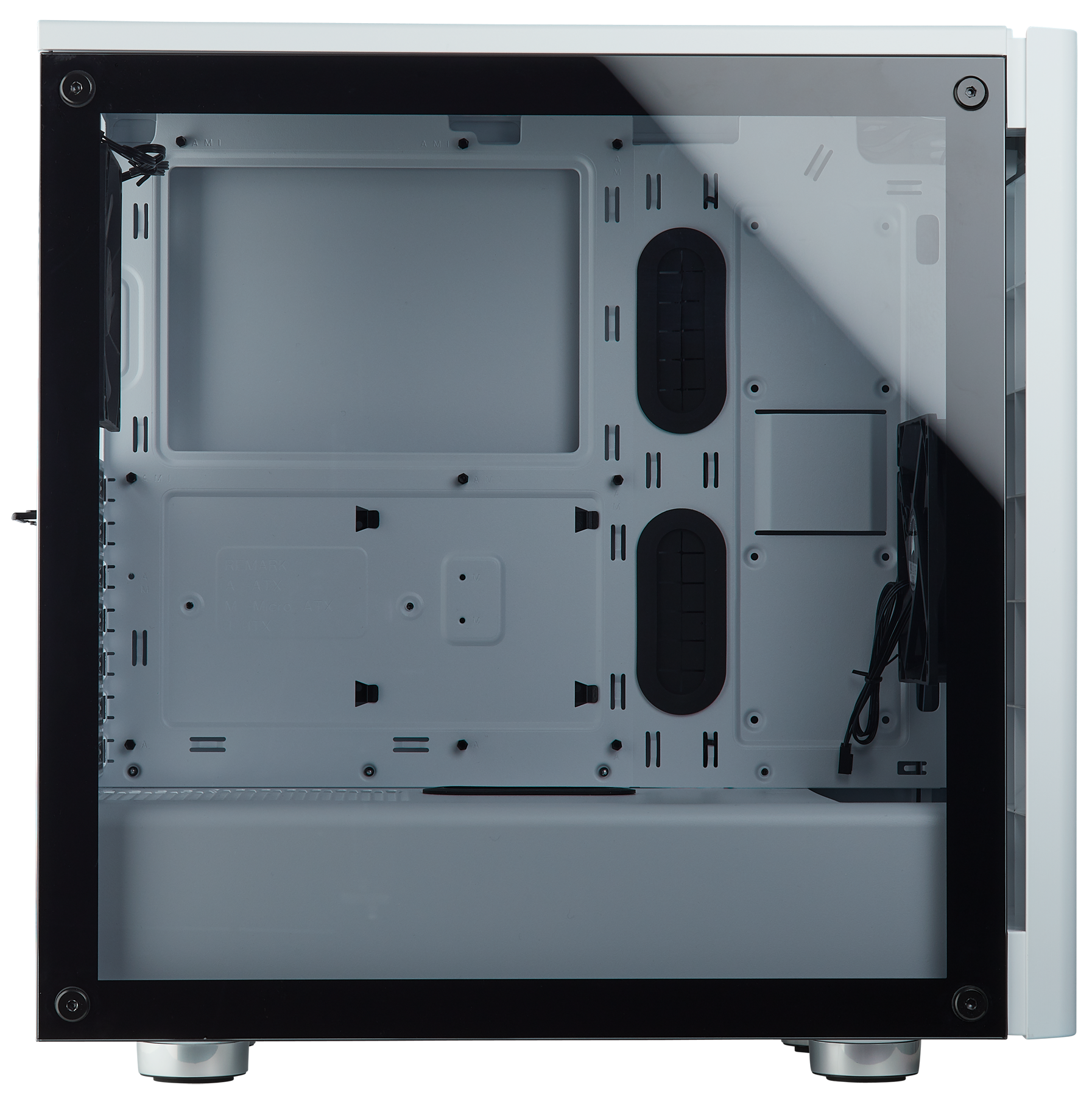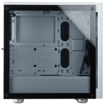 Corsair’s priority is a sleek design, giving access to showcase internals via a tempered glass or an edge-to-edge acrylic side panel, with the latter shifting costs slightly lower. Covering the power supply unit is crucial to keep things neat and tidy, with the shroud reflecting the colour of the case. Users have a choice between black or matte white with a black frame, each emblazoned with the Corsair logo at the base of the front panel.