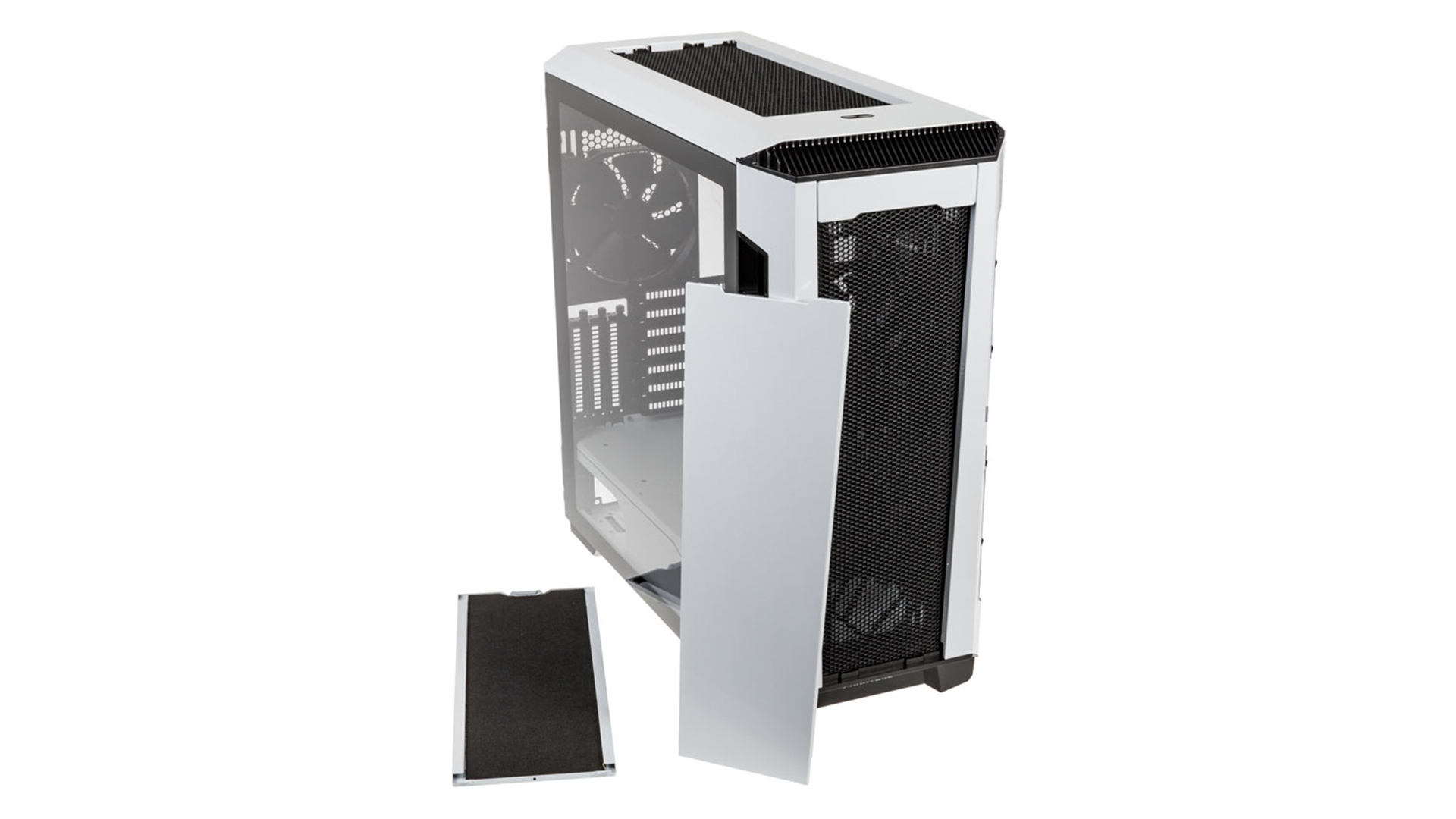 On the surface, the Eclipse P600S looks almost futuristic with sleek front and top panels that help to dampen sound. Peeling these back, Phanteks pre-installs three 140mm PWM fans behind a new dual layer high-airflow mesh design, with one panel embedded below the front I/O and another deeper into the front of the chassis. The firm states that this “reduces the loss of air-intake caused by using traditional high density mesh.” While this allows users to operate using low-RPM fans, the case will be at its quietest with all panels attached.