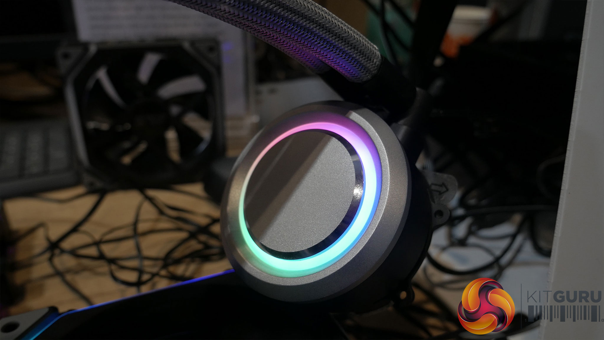 Moving on now to the Galahad 240 AIO liquid cooler. This is interesting as the pump isn't on mounted on the CPU block, as per almost every other AIO on the market, but instead it sits attached to the radiator – Leo reckons this is to get around Asetek's pump patents. The CPU block also sports a magnetic cover which you can remove completely – to show off more of the RGB lighting – or you can even attach your own magnetic cover if you want.