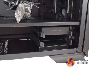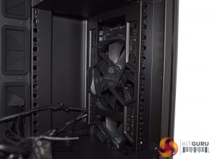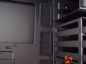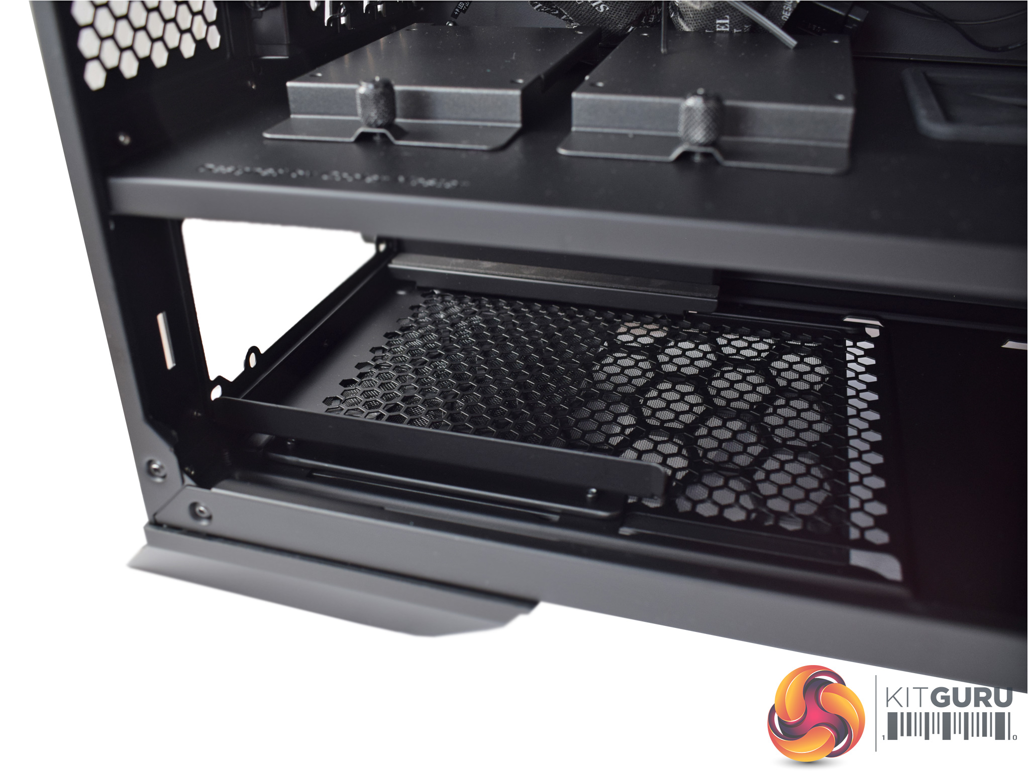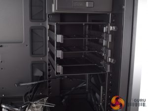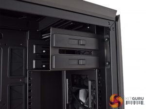 Underneath the 5.25″ bays we find 3x 3.5/2.5″ drive caddies – also fully removable. You can even re-position these bays if you want to move them down a bit – there is a lot of control over the bay positioning as it can slot into a row of holes that run parallel to the rubber grommets.