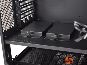 Sitting atop the PSU shroud are 2x dedicated SSD mounts, each held in place with a single thumbscrew.