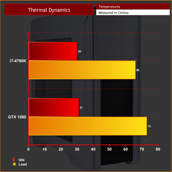 As you can see, the Falcon's out-of-the-box cooling is absolutely fine. The above temperatures were taken with the fan controller set to low-speed as well – temperatures definitely benefit from having 2x 120mm fans intaking fresh air to the chassis.