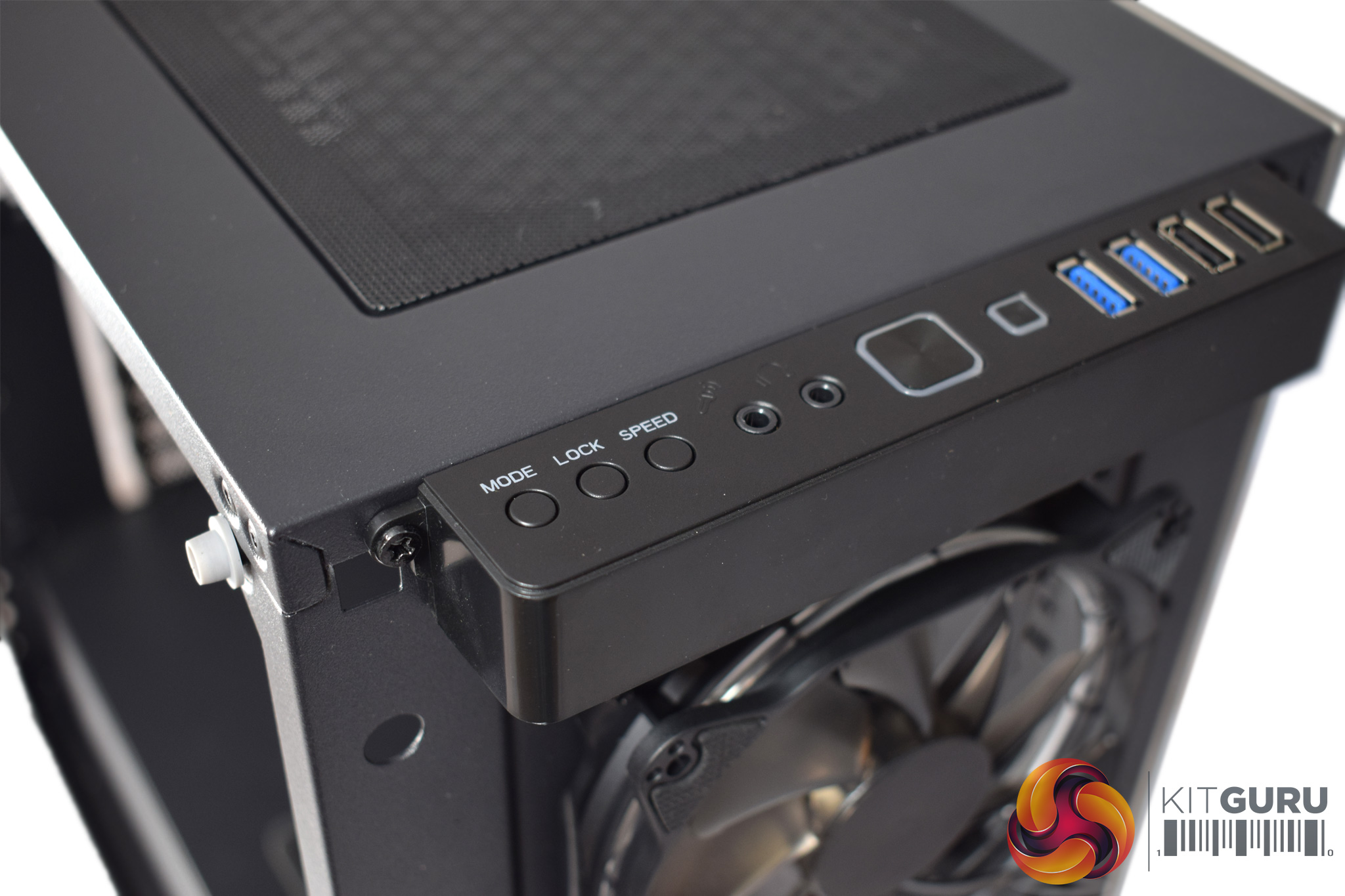 In terms of the front panel I/O, the selection is plentiful. On the left-hand side, we find 3 different buttons that are linked to the fan controller: you change the RGB LED colour, set the speed and lock the setting to prevent accidental changes. Next to the fan-control buttons are the headset jacks, while 2x USB 2.0 and 2x USB 3.0 ports can be found on the right-hand side.