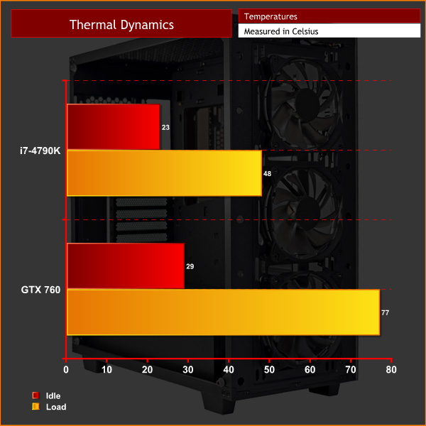 As you can see, thermal performance is very good. I did use a class-leading liquid cooler in the Liquid Freezer 240, but the 3 intake fans at the front of the chassis supply a good amount of air to the GPU as well, for which a 77 degree peak temperature is very good.