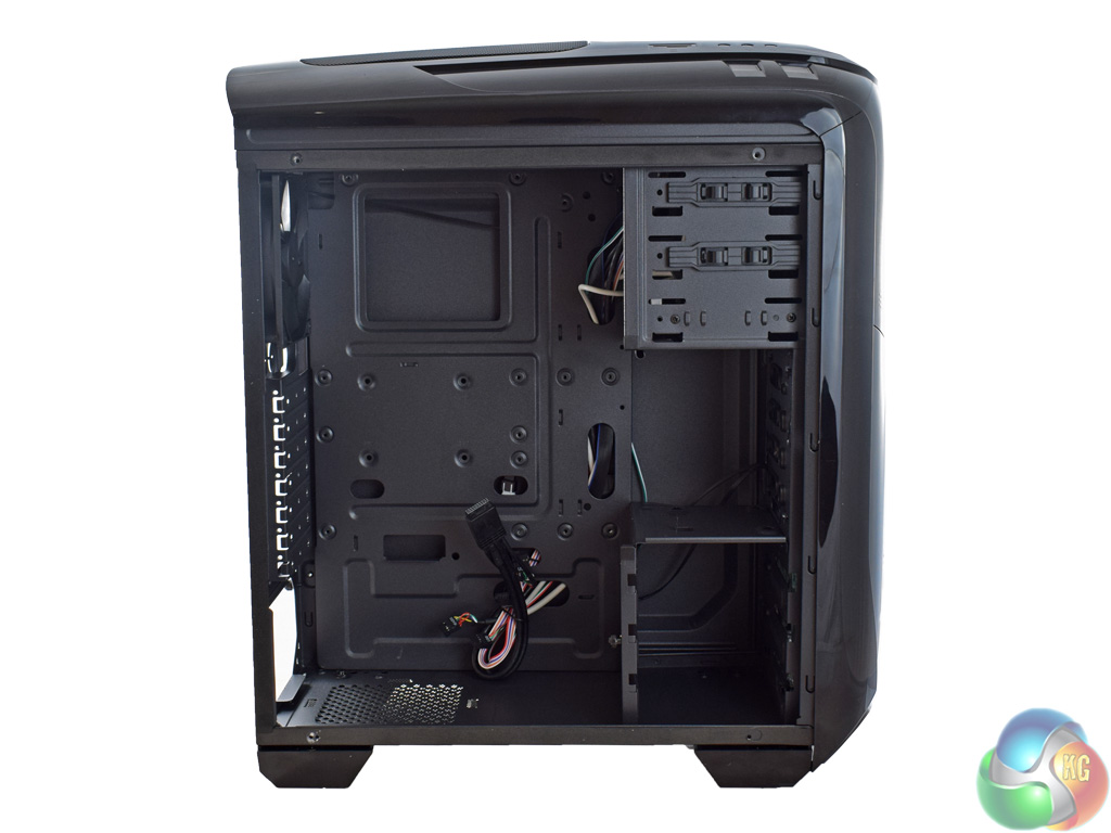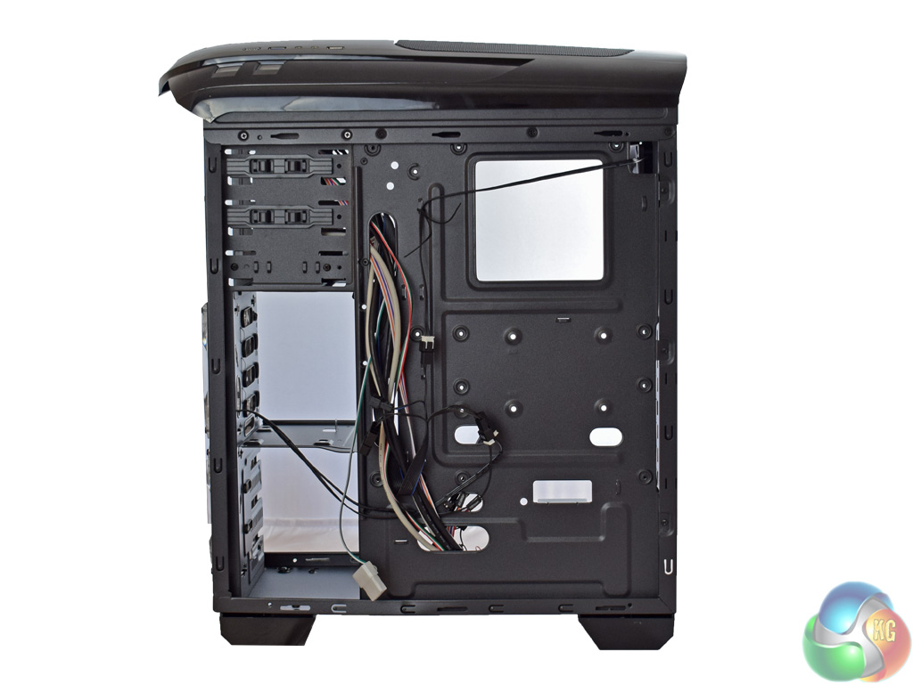 Taking off the side panel, we get our first look at the innards of the chassis. It is immediately apparently space is a bit tight – the 5.25in drive bays do eat up some of the room, while the 3.5in drive cage at the bottom also fills up the case's space.