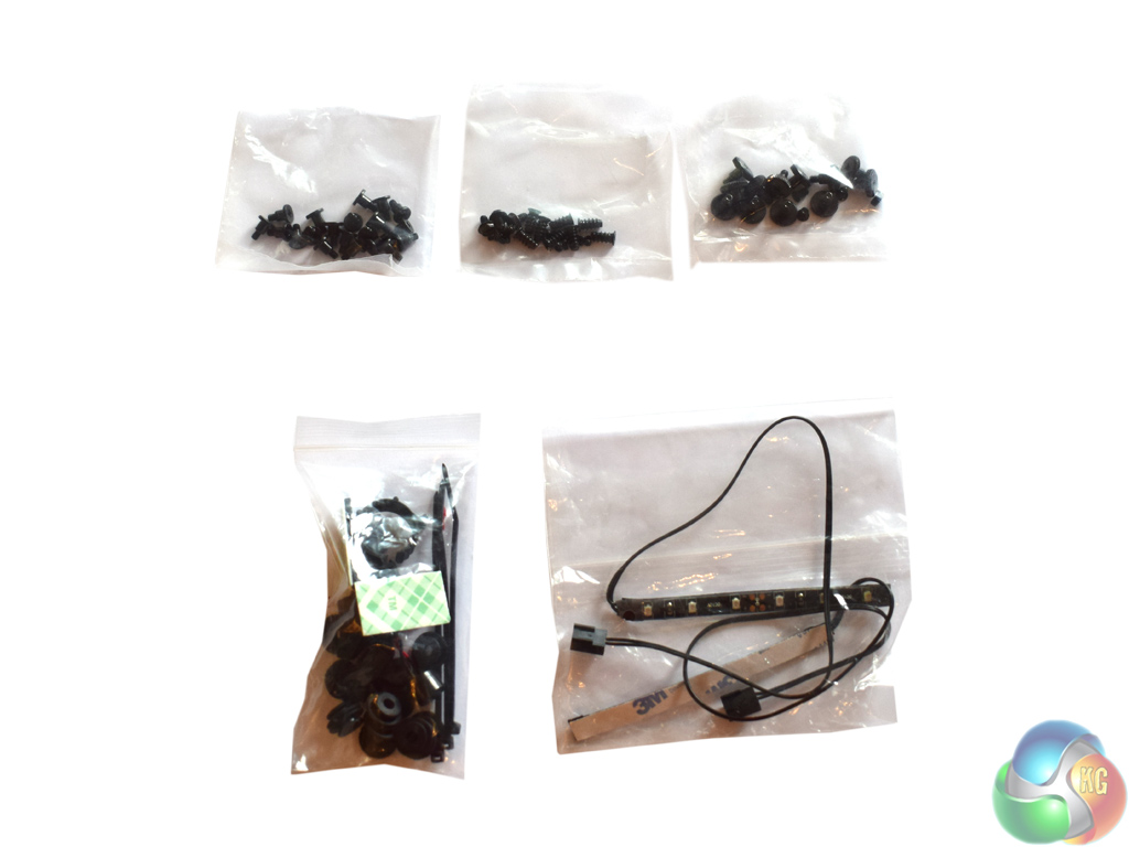 Of course, there are some standard motherboard standoff screws – 4, as it is an ITX case – as well as plenty of extra fan screws.